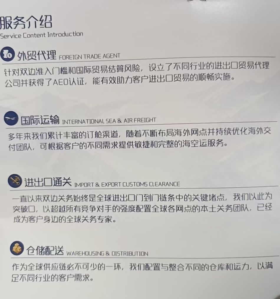 【2】国际海空运:多年来我们累积了丰富的订舱渠道,随着不断布局海外网点并持续优化海外交付团队,可根据客户的不同需求提供敏捷和完整的海空运服务。