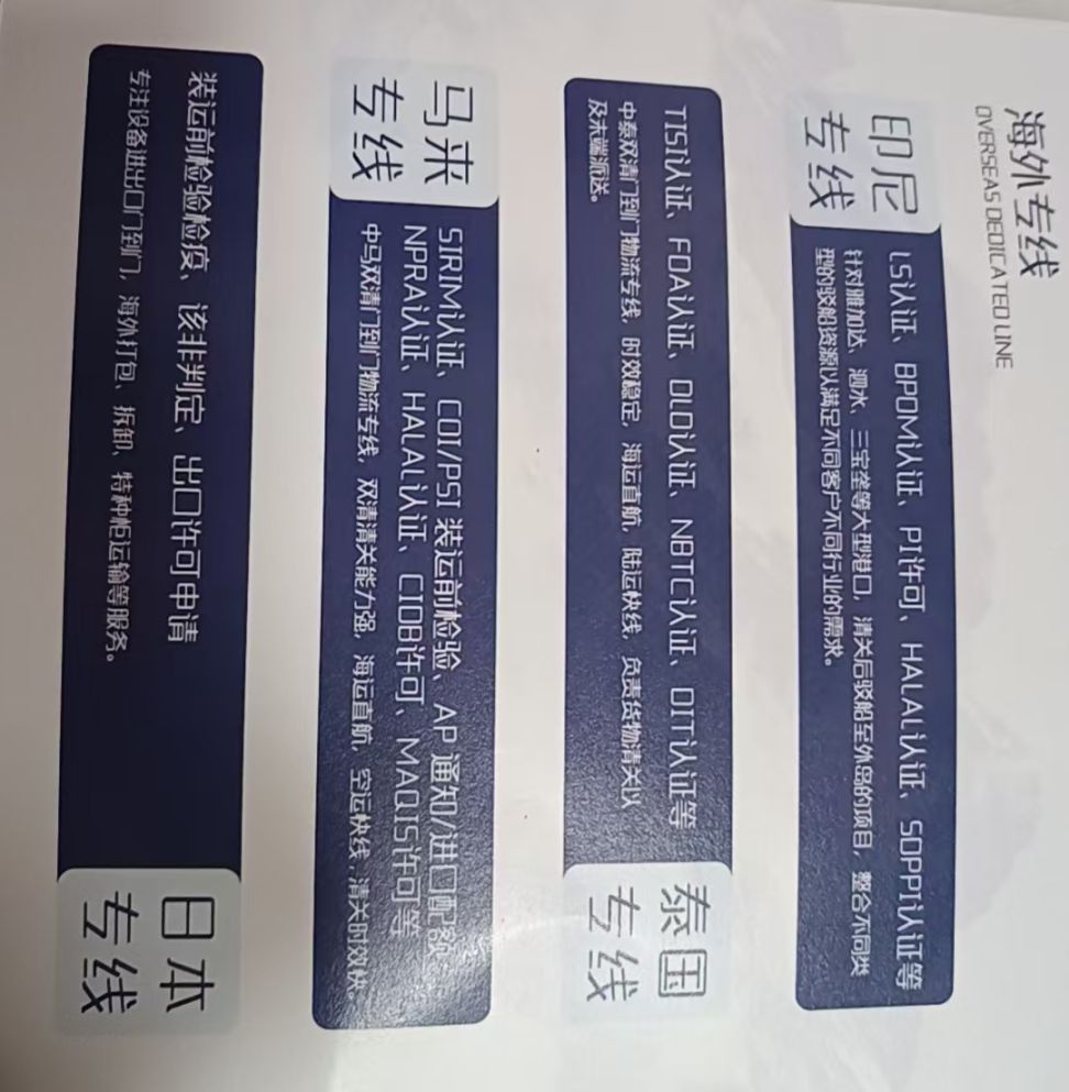 1. 获AEO认证,通关能力强;2. 海外专线覆盖东南亚,支持多类认证(如印尼LSI、泰国TISI);3. 国内10家分公司+海外4家分公司,覆盖9大口岸
