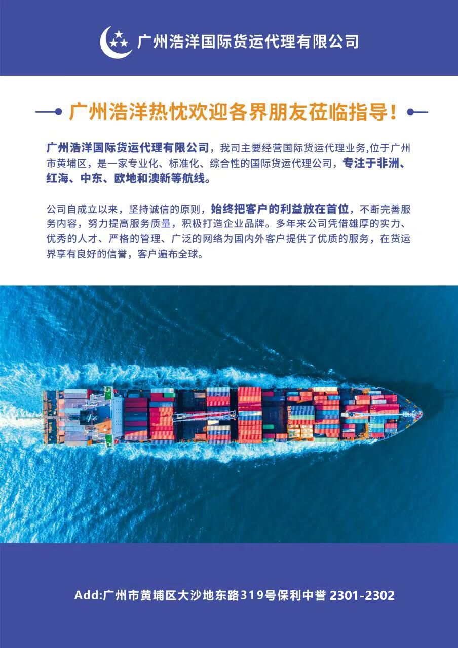 广州浩洋国际货运代理有限公司,我司主要经营国际货运代理业务,位于广州市黄埔区,是一家专业化、标准化、综合性的国际货运代理公司,专注于非洲、红海、中东、欧地和澳新等航线。