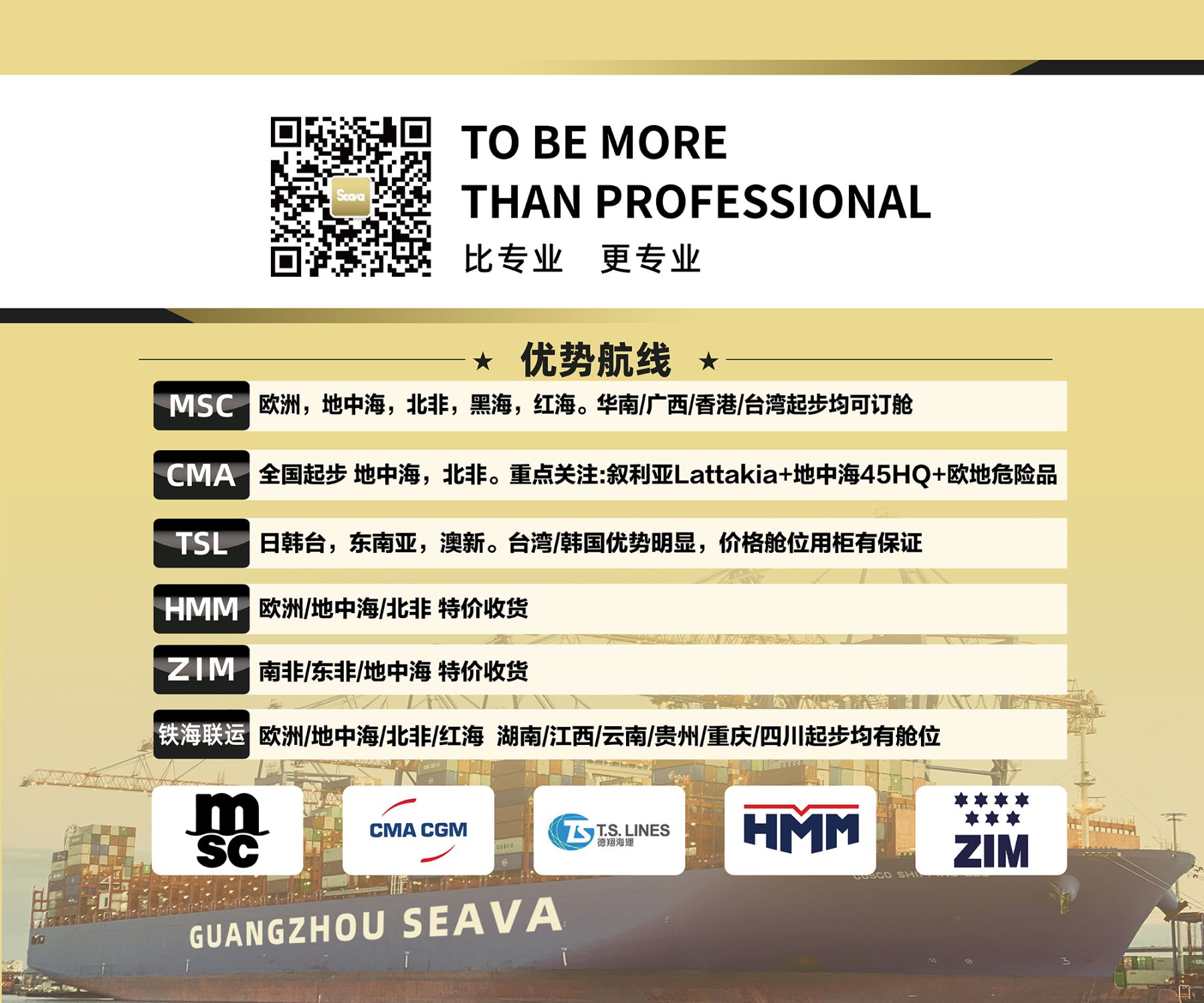 主营航线:欧洲、地中海、黑海、北非、红海、日韩台、南美、南非,船东:MSC地中海航运/CMA达飞轮船/TSL德祥海运/HMM韩新航运/ZIM以星航运