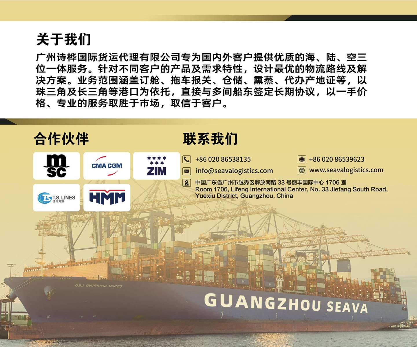 广州诗桦国际货运代理有限公司专为国内外客户提供优质的海、陆、空位一体服务。针对不同客户的产品及需求特性,设计最优的物流路线及解决方案。业务范围涵盖订舱、拖车报关、仓储、熏蒸、代办产地证等,以珠三角及长三角等港口为依托,直接与多间船东签定长期协议,以一手价格、专业的服务取胜于市场,取信于客户。