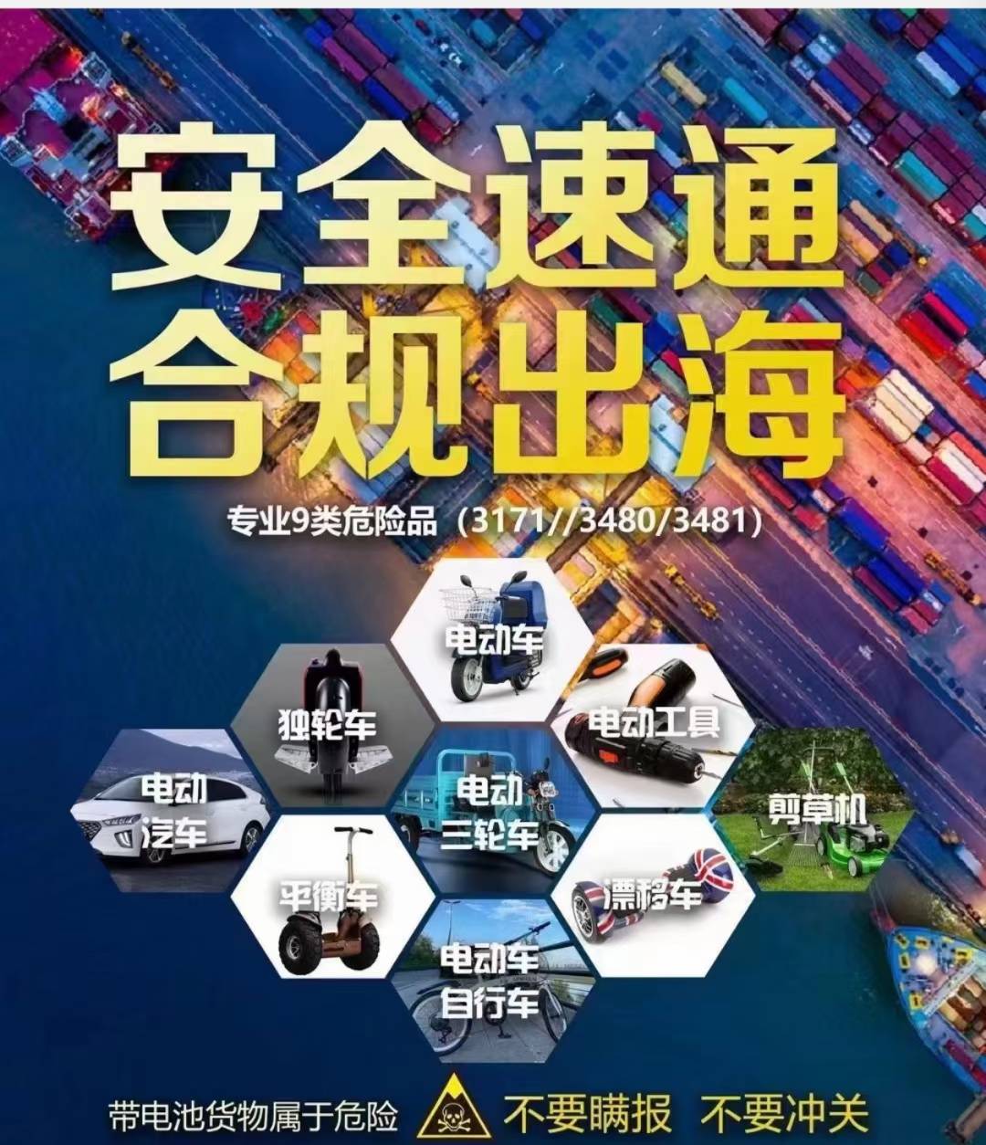 危险品海运订舱-危险品拖车进港直装-危险品港口仓库内装 危险品海事申报(2类灭火器/制冷剂/礼花/空气清新剂等 3类化妆品 4类酒精湿巾 9类锂电池系列) 危险品出口报关/出口危险品第三方监装等全链条一条龙服务。 新能源电动车辆海运出口