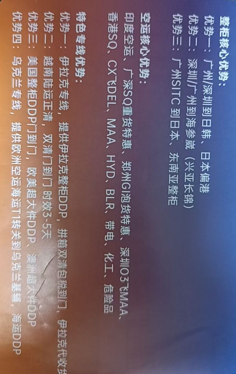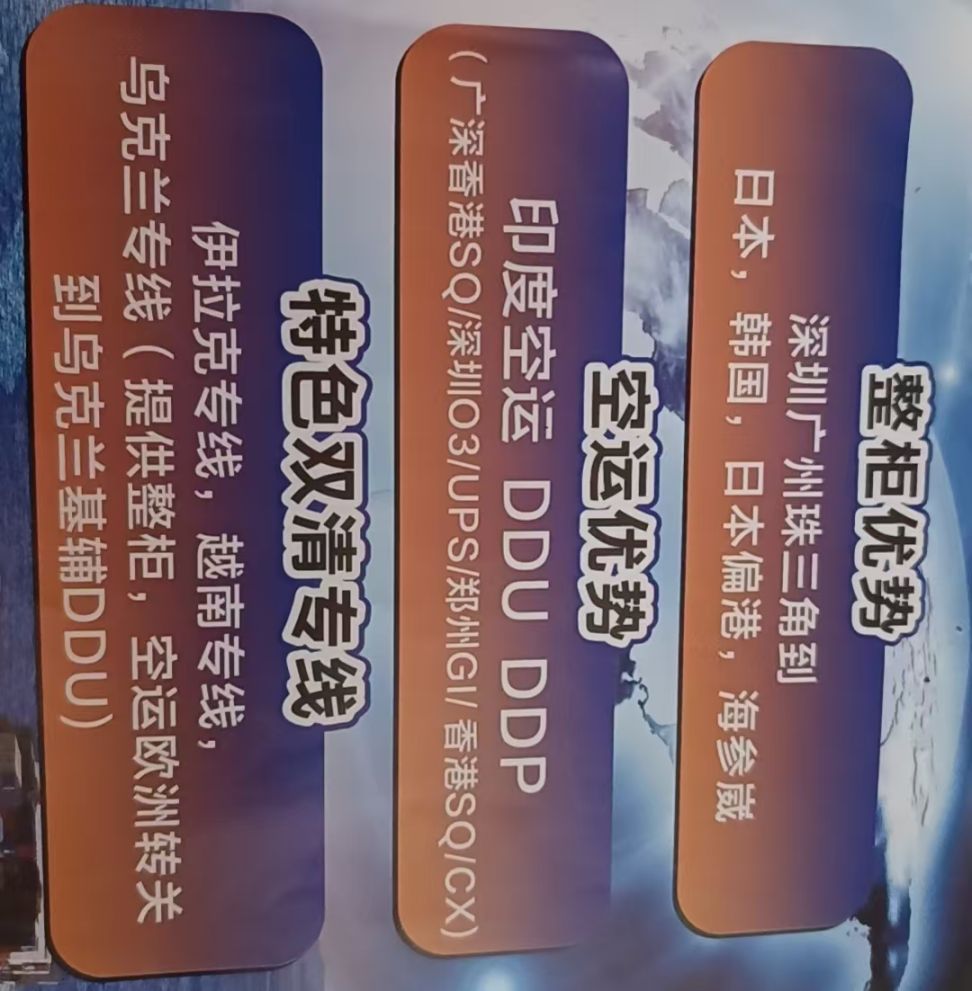 主营:印度空运DDU,伊拉克专线,美国岛屿双清门到门(夏威夷,阿拉斯加,波多黎各)东北亚(海参崴,日韩),东南亚,南美,非洲其他经营项目:香港公司注册,审计,香港保险,投资理财