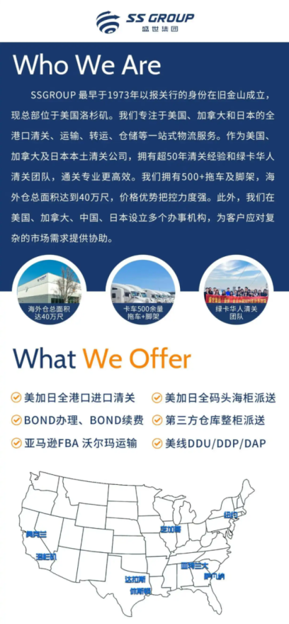 盛世集团 (SS Group) 最早于1973年在旧金山成立,作为一家报关行。总部位于美国洛杉矶,公司专注于提供美国各大港口的报关、运输和仓储一站式服务。作为一家拥有超过50年经验的本地清关公司,盛世集团拥有自营的绿卡华人清关团队。