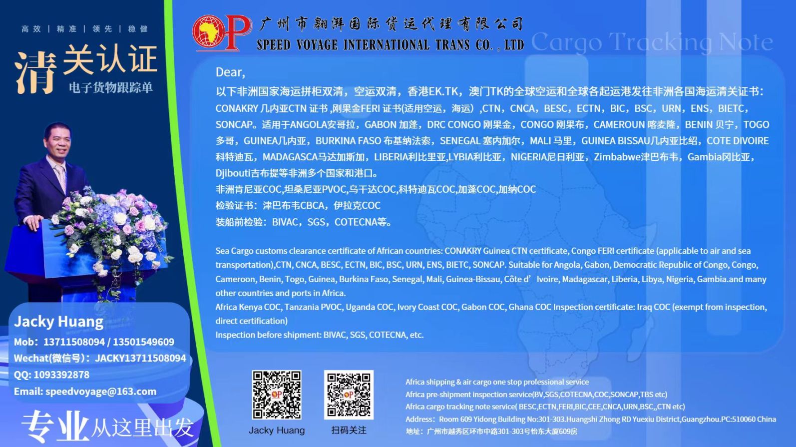 专注的非洲各国海运拼柜双清、空运双清业务。目前可以覆盖非洲20多个国家的海运拼柜双清,空运双清,为中非贸易的中小型客户提供物流上的便利。