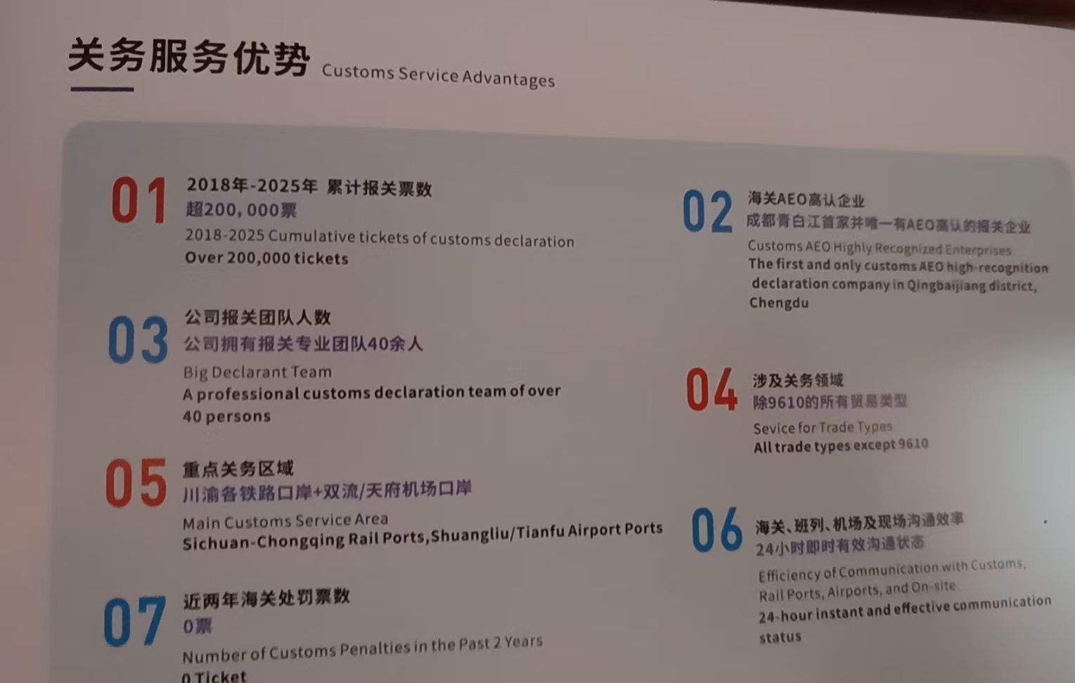 1. 成都青白江首家且唯一AEO高认报关企业;2. 2018-2025累计报关超20万票,近2年海关处罚0票;3. 40余人专业报关团队,24小时海关/班列/机场现场沟通