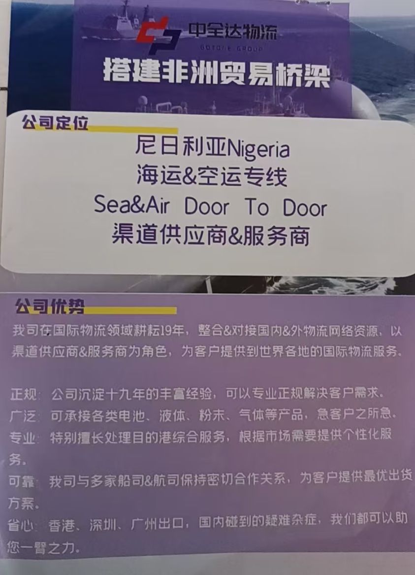 1. 尼日利亚海&空专线(门到门双清);2. 承接电池/液体/粉末/气体等特殊品类;3. 自有1万平仓库,提供个性化物流方案