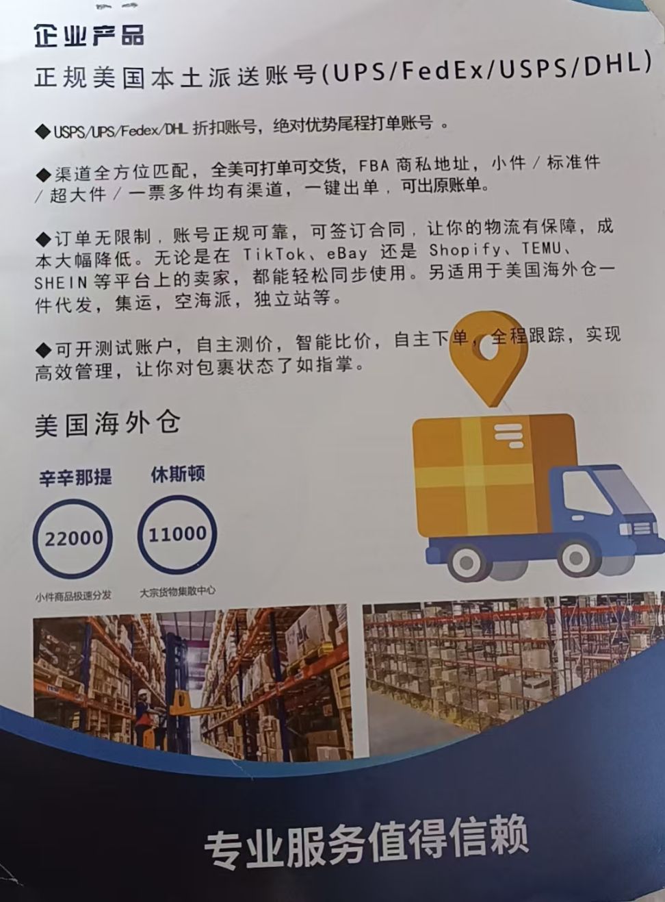 1. 美国本土派送(UPS/FedEx/USPS账号);2. 美国海外仓(辛辛那提/休斯顿)一件代发/仓储;3. 集运、空海派、独立站物流等