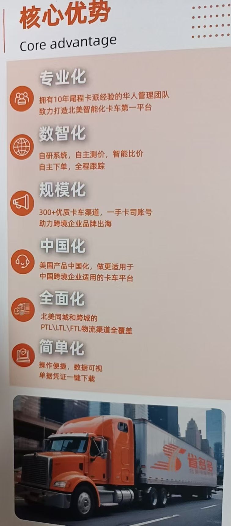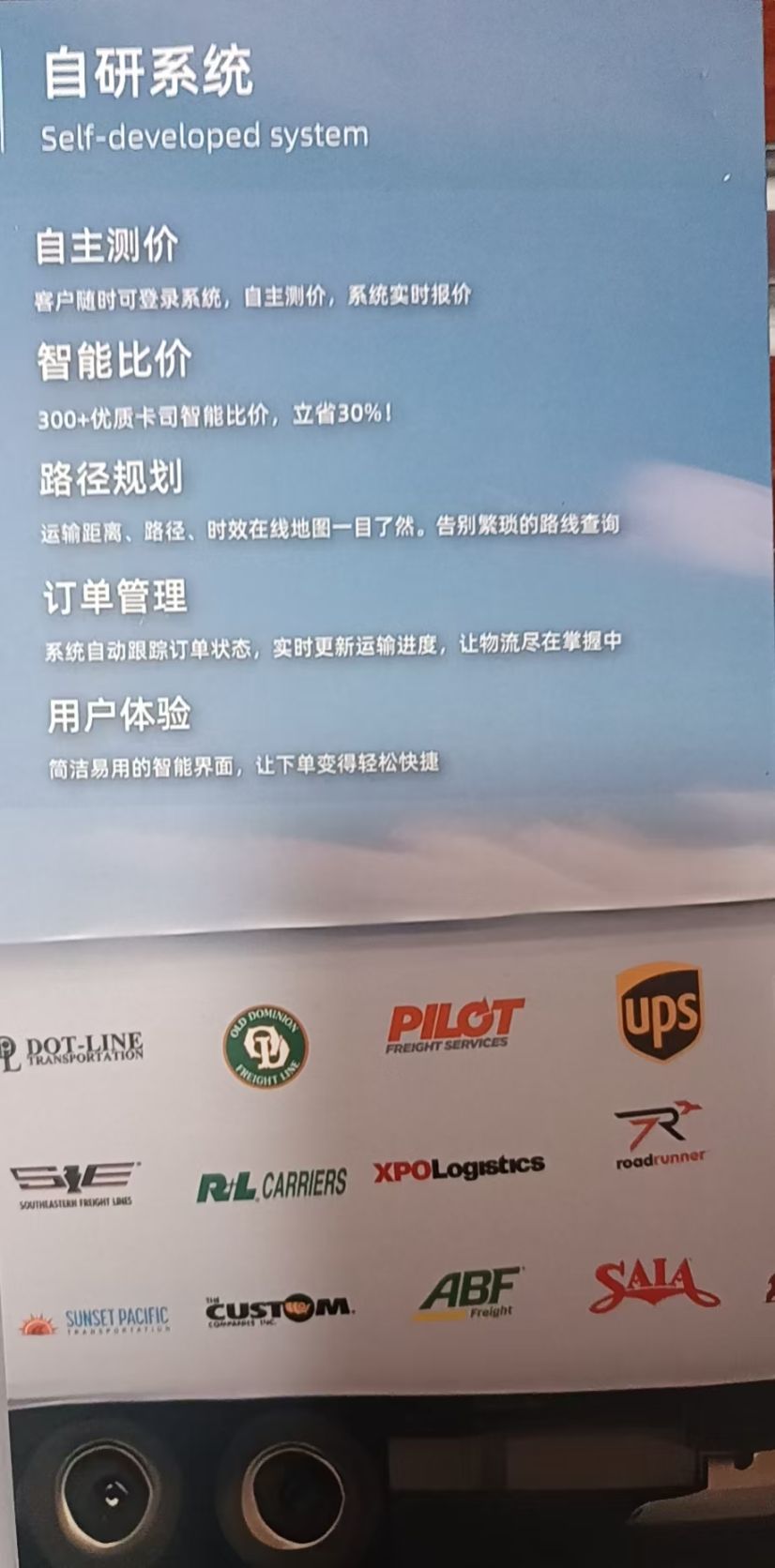 1. 自研系统支持自主测价、智能比价(立省30%)、路径规划;2. 覆盖美加墨90州及岛屿,日处理订单2000+;3. 有特种许可可运输特大/特重货物,亚马逊官方运营合作