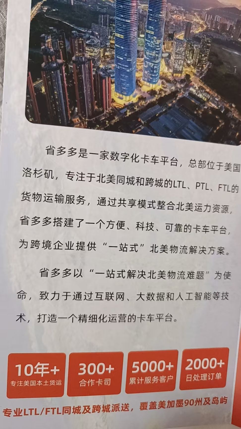 省多多是一家数字化的卡车平台,总部位于美国洛杉矶,专注于北美同城和跨城的PTL、LTL、FTL的货物运输服务,通过共享模式整合北美运力资源,省多多搭建了一个方便、科技、可靠的卡车平台,为跨境企业提供"一站式"的北美物流解决方案。省多多以"一站式解决北美物流难题"为使命,致力于通过互联网、大数据和人工智能等技术,打造一个精细化运营的卡车平台。