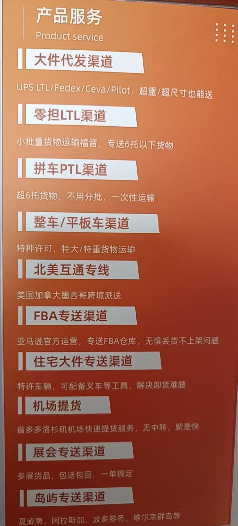 1. 北美同城/跨城LTL/PTL/FTL货物运输;2. 大件代发、零担/拼车运输;3. FBA专送、住宅大件/岛屿专送;4. 展会/机场提货运输