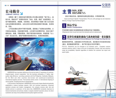 安晟鸿(厦门)国际货运代理有限公司长期以来秉持"客户至上、诚信为本、精诚合作"的服务宗旨和"安全、优质、高效"的经营理念,为客户提供菲律宾、印度尼西亚、马来西亚等多个国家门到门以及仓到仓的全程国际物流服务。业务主要为各种货物的国际代理运输,包括海运、空运。