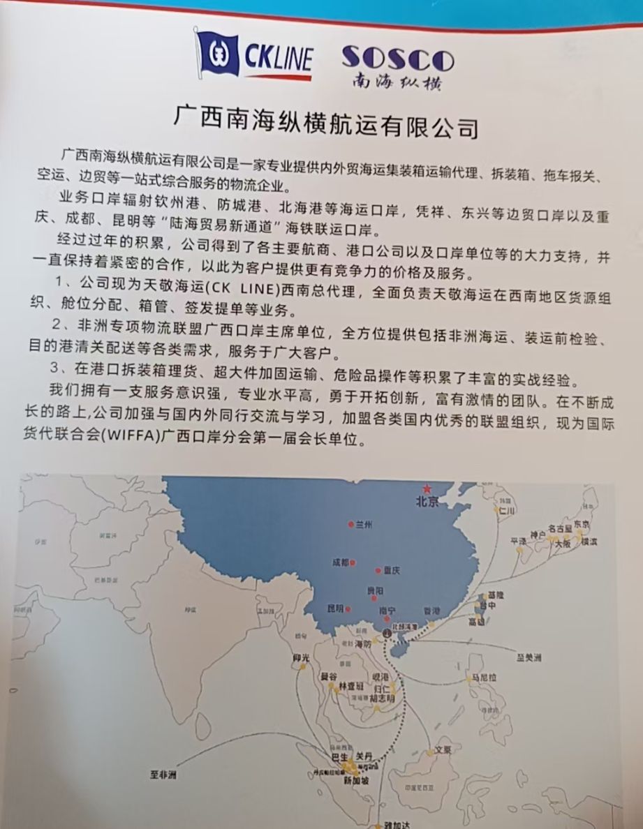 广西南海纵横航运有限公司(SOSCO)是一家专业从事国际货物运输的代理企业,是交通部批准的NVOCC无船承运人。您在广西值得信赖的物流供应商合作伙伴!在南宁、钦州港、防城港、重庆均有分公司或办事处,做好当地服务。