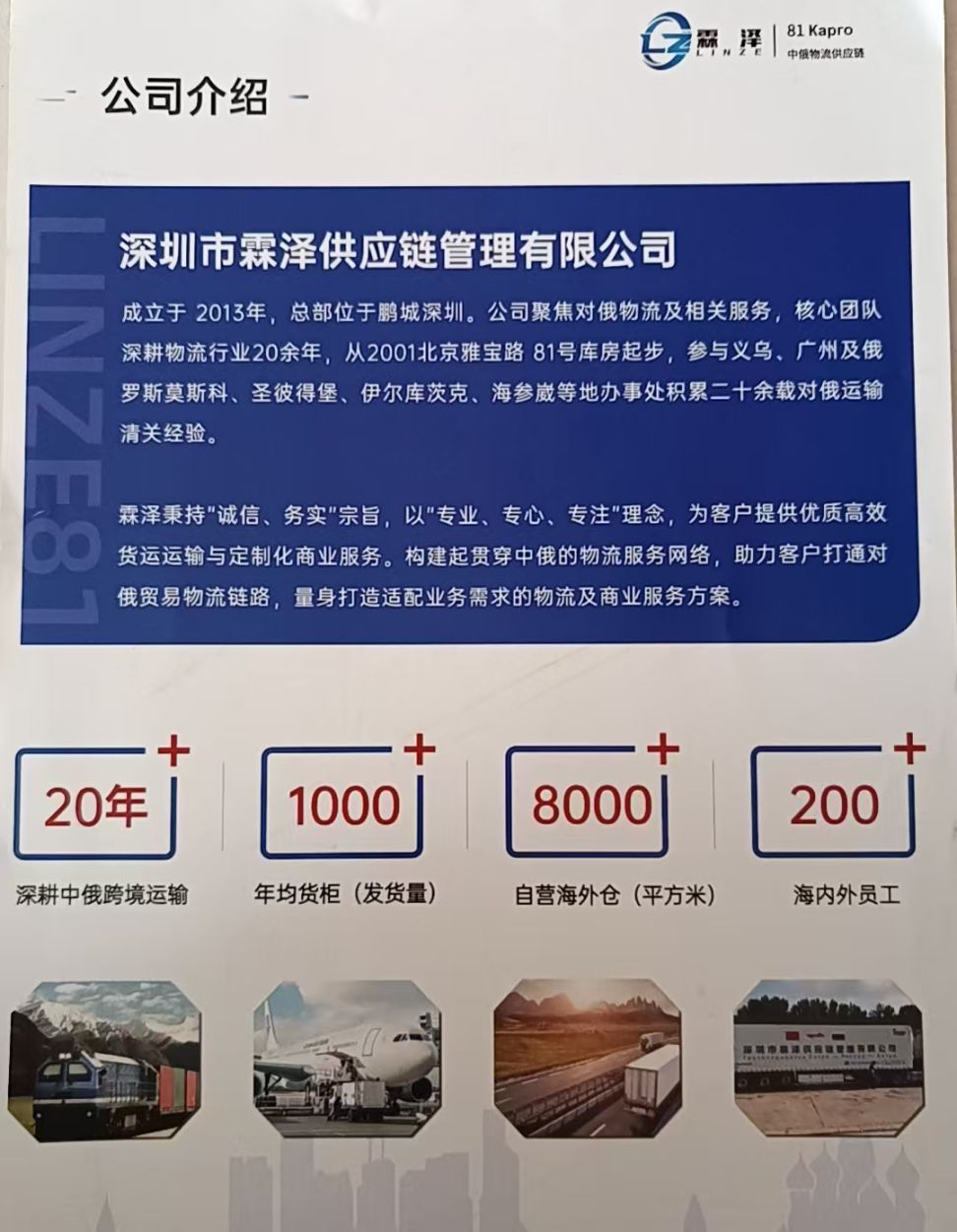 霖泽供应链成立于2013年,总部在深圳,团队深耕中俄跨境物流二十余年,先后在广州、义乌、莫斯科设立办事处,在2024年设立俄罗斯分公司