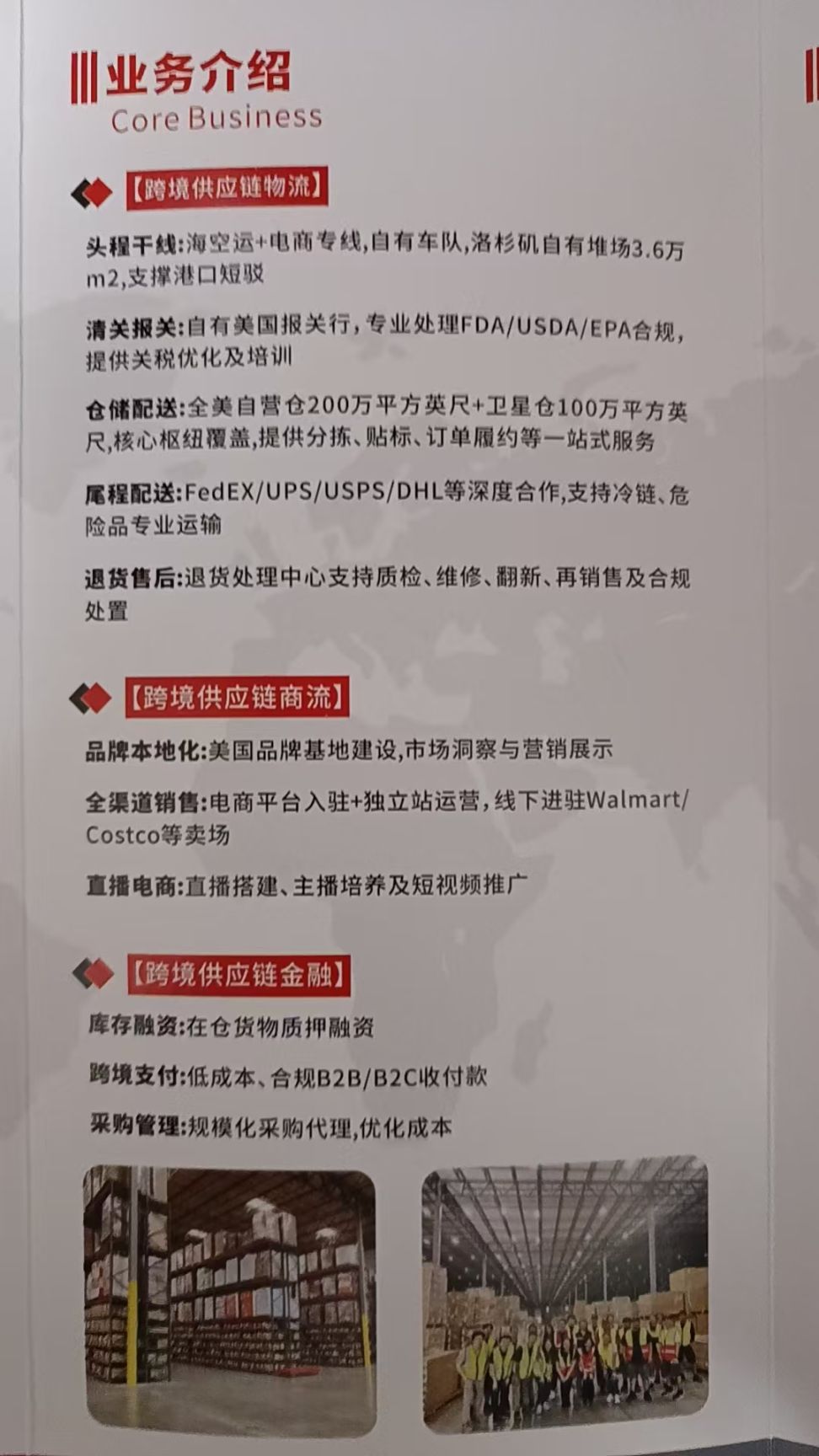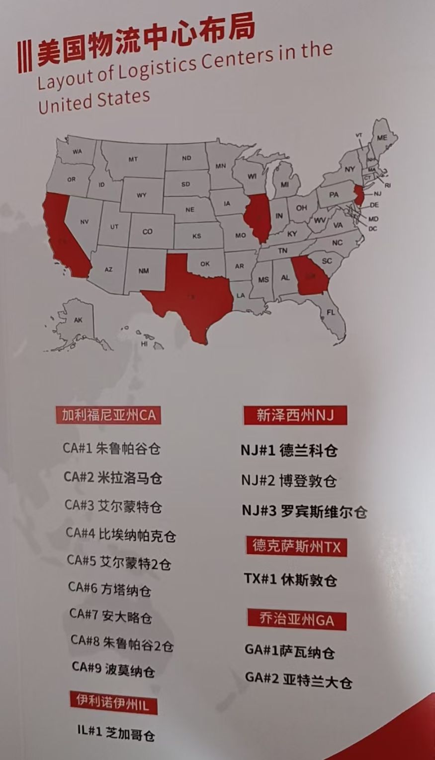 1. 美国自有仓200万平方英尺+卫星仓100万平方英尺,覆盖加州/新泽西/德州等多地物流中心;2. 洛杉矶自有堆场3.6万㎡,自有车队,与FedEX/UPS/DHL深度合作;3. 自有美国报关行,处理FDA/USDA/EPA合规,支持冷链/危险品运输;4. 提供退货售后(质检/维修/翻新)、品牌入驻Walmart/Costco等服务