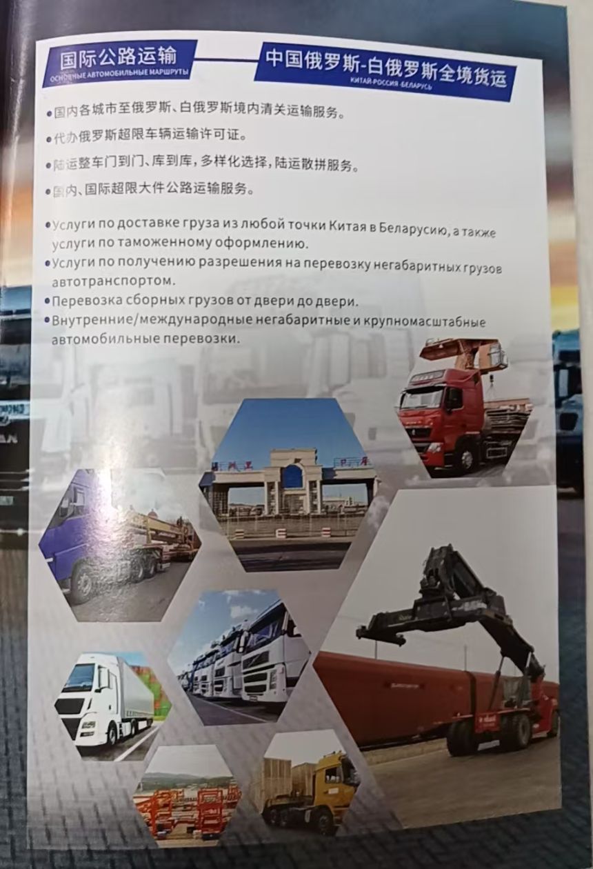 1. 国际公路运输(中国-俄罗斯/白俄罗斯全境货运);2. 代办俄罗斯超限车辆运输许可证;3. 陆运整车门到门/库到库、散拼服务;4. 国内/国际超限大件公路运输
