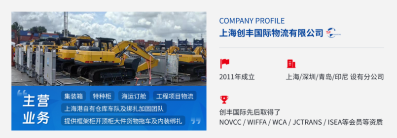 总部位于上海,2011年成立,注册资金1000万,自营特种柜大件车队及仓库,提供集装箱、特种柜、框架柜、开顶柜、大件运输、绑扎、报关、保险、海外DDU/DDP。