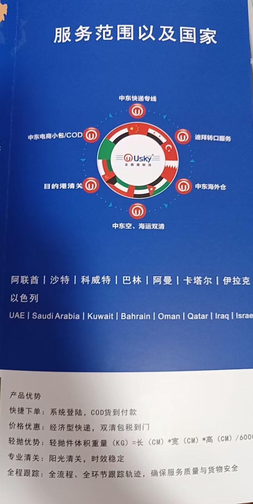 全酋通物流有限公司UskyExpress,2010年成立于迪拜阿联酋,创始团队拥有20年以上的国际物流经验,并且公司扎根迪拜,专注于阿拉伯地区的空、海运物流运输,海外清关及派送服务。业务范围覆盖:阿联酋、沙特阿拉伯、科威特、巴林、阿曼、卡塔尔、伊拉克、以色列等国家。
