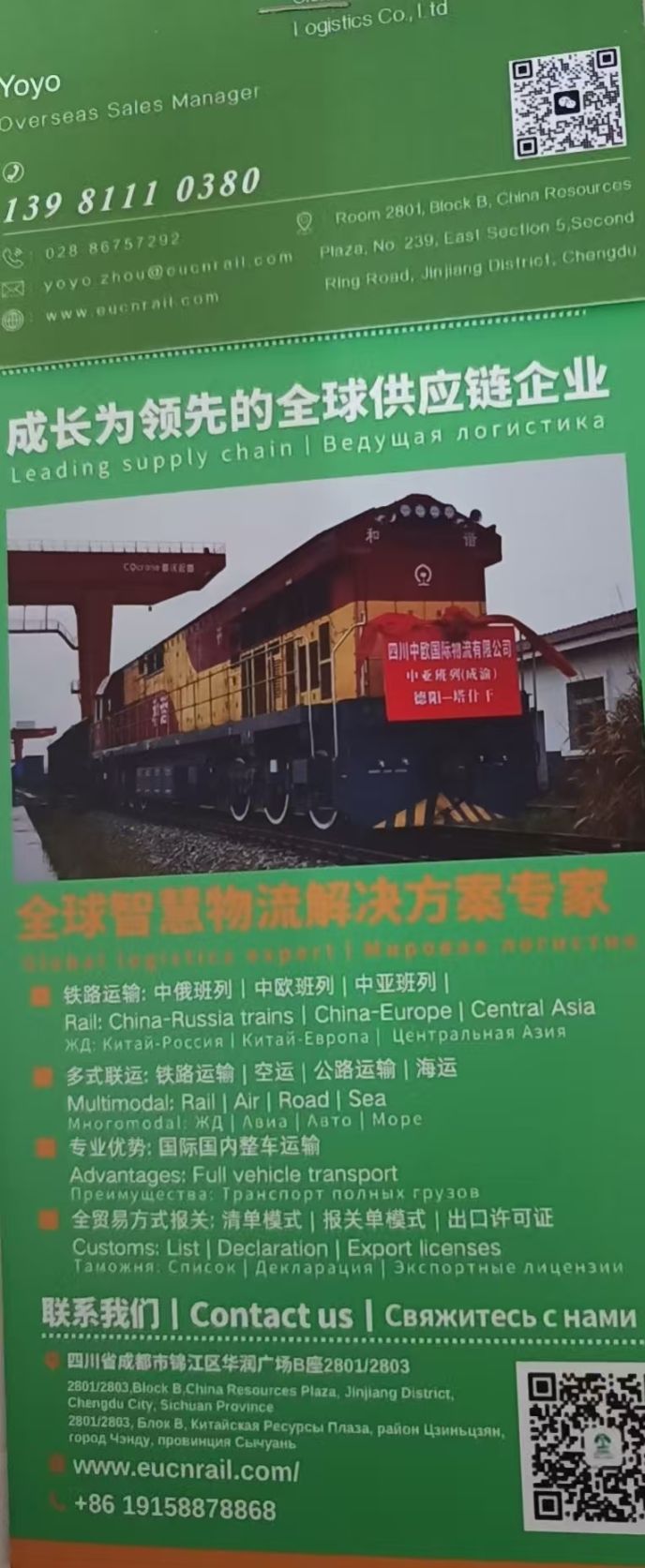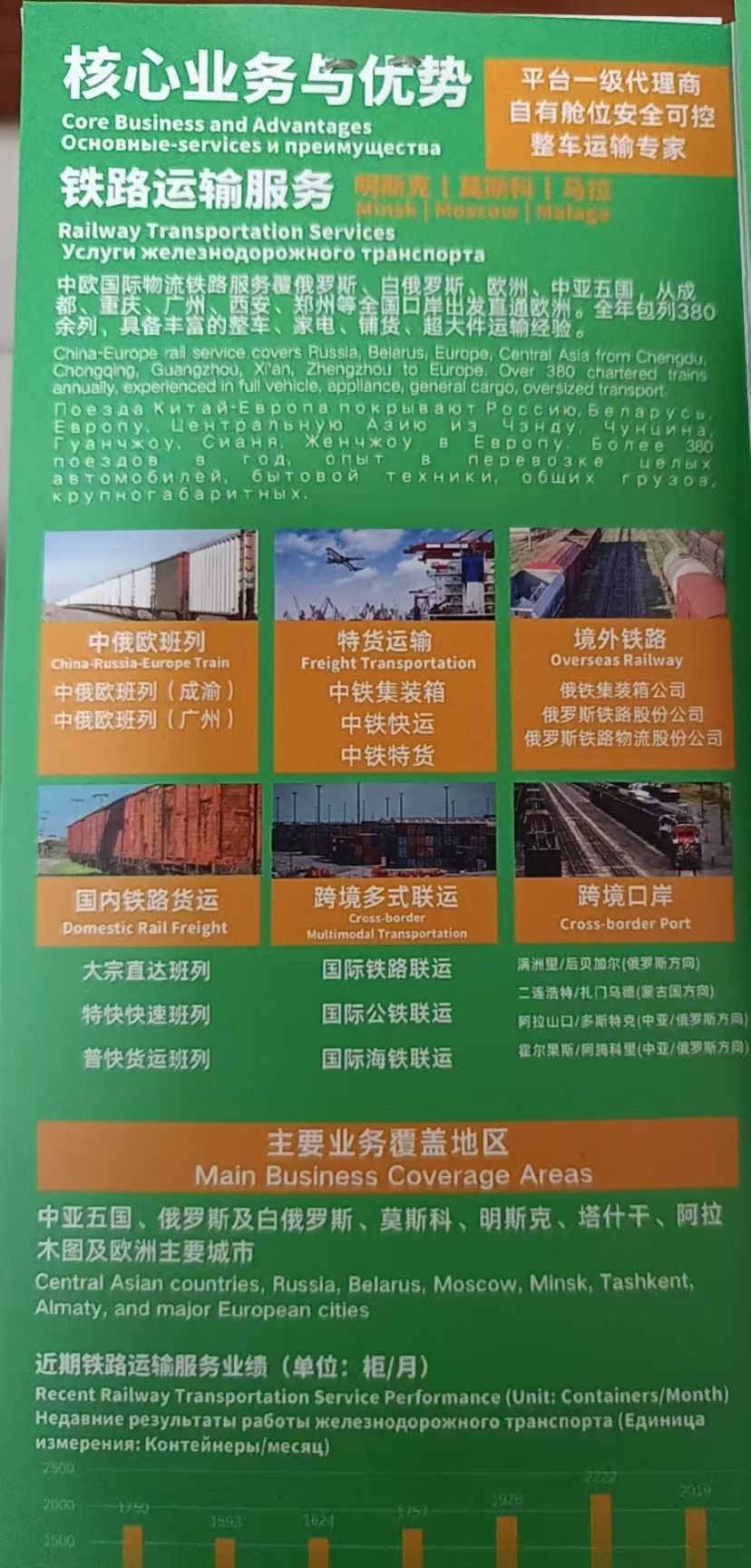 1. 中欧班列稳定发运(月均40+列);2. 俄罗斯空运/铁路直达(莫斯科等城市);3. 定制化物流方案(含大件/危险品);4. 跨境电商报关资质(成都首批)