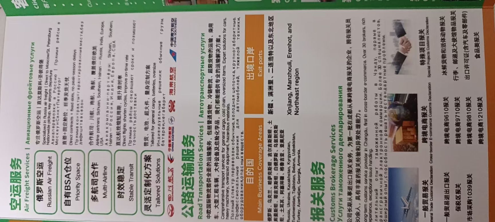 1. 铁路运输(中欧/中俄班列等);2. 多式联运(铁/空/路/海);3. 空运服务(俄罗斯专线);4. 公路运输(大件/危险品);5. 报关服务(贸易/跨境电商等)