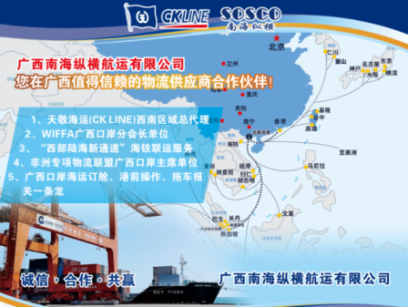 广西南海纵横航运有限公司(SOSCO)是一家专业从事国际货物运输的代理企业,是交通部批准的NVOCC无船承运人。您在广西值得信赖的物流供应商合作伙伴!在南宁、钦州港、防城港、重庆均有分公司或办事处,做好当地服务。