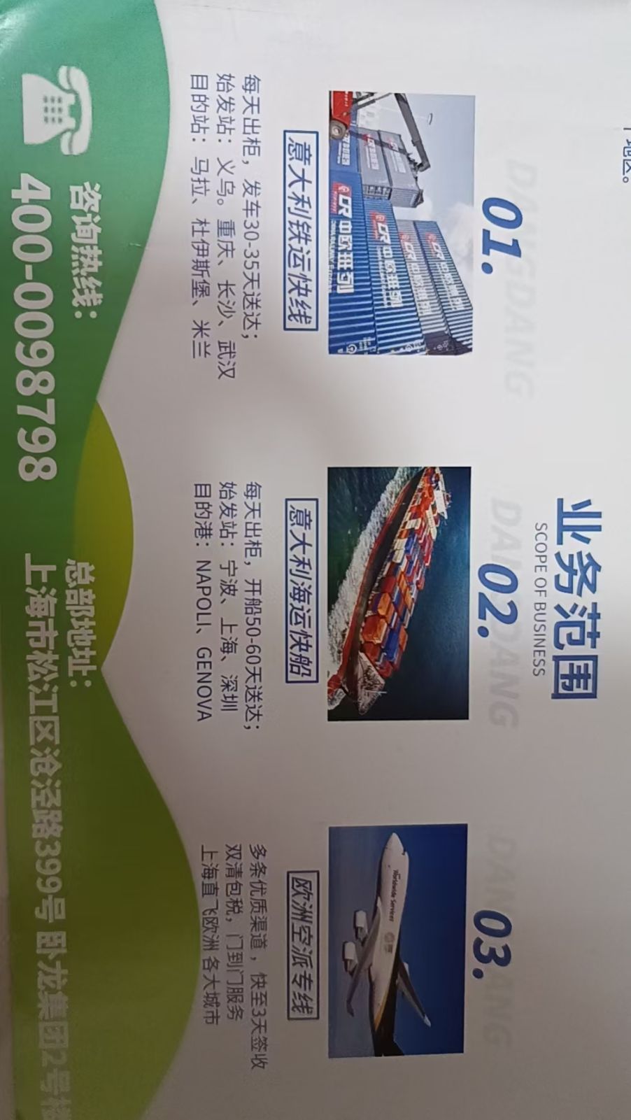 - 核心专线:意大利专线(海运、铁运、卡航、空运),深耕欧洲华侨华商市场